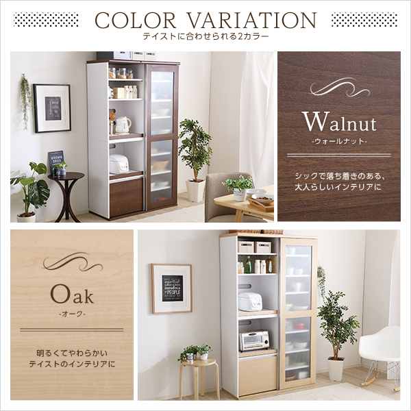 ●収納スペースを左右に分け、左側に家電収納棚やフルオープンの引出し、右側に食器収納棚を設けています