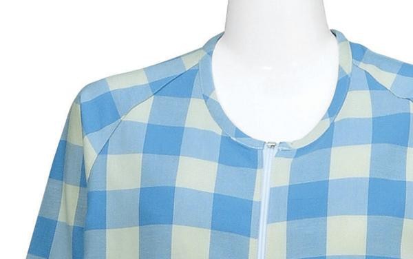 胸元にホックのないスマートなデザイン。右足首から胸元のファスナーと、股部分のファスナーで、着替えや介護が楽にできます。前身ごろ、股下がめくれます。
