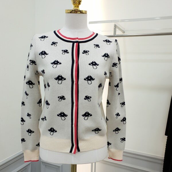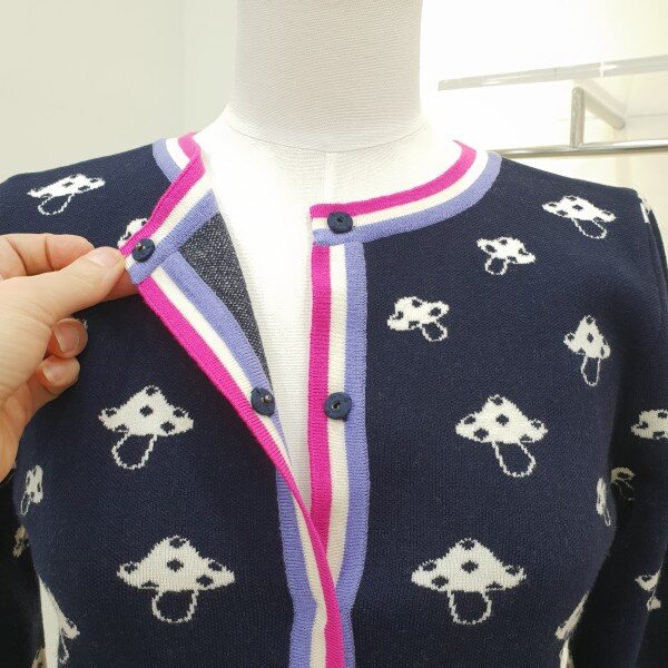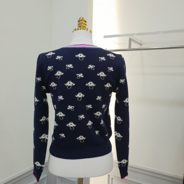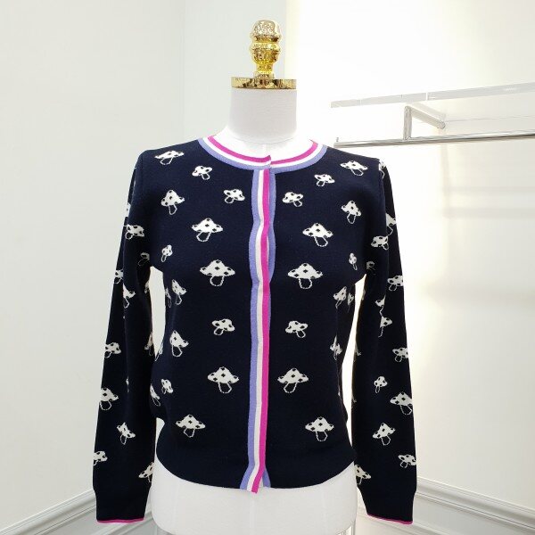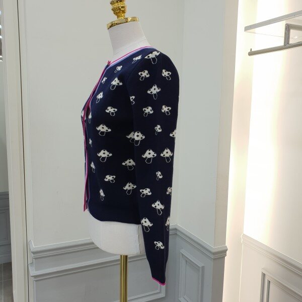 버섯모양의 자카드가 귀여운가디건입니디ㅣ~♡♡앞단추여밈부분과 소매끝단을 스트라이프배색처리로 포인트 겨울 코트안 이너아이템으로도 좋으실듯싶어용~~총장48cm