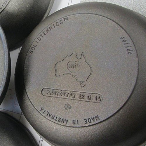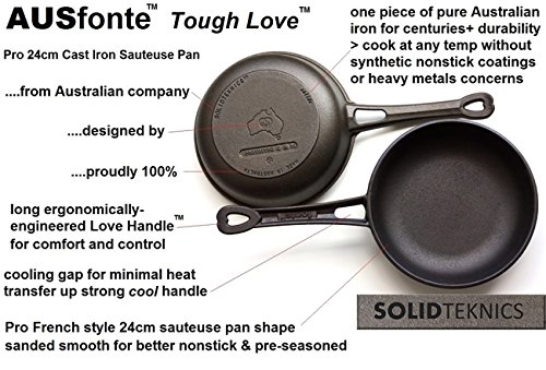 AUSfonteTM Tough Love cast iron pans by SOLIDTEKNICSTM - Features and benefits: Innovative Australian design by food-loving mechanical engineer MJ Henry (the Rachael Ray Furi knife designer), after decades of design for chefs in Australia, USA and France: Love Handles: The most comfortable ergonomic/dynamic handle ever put on a cast iron pan. Engineered long and broad where it counts for more comfort and control, with cooling gap for minimal heat transfer up handle (last half does not become too hot to handle on stove top cooking). Compare our Love Handle with traditional stubby little hot cast iron handles. French-style sauteuse pan body: deeper and rounder than a traditional skillet for the classic sauté toss and more pro chef versatility. Bringing back smooth 'antique' cast iron cooking surfaces: Unique nowadays, AUSfonte pans have a cooking surface smoothed down by a proprietary manual/machine process (like prized antique pans). More nonstick than modern rough cast production pans. (Note: rough bumps are removed but dimples remain to anchor seasoning better than completely smooth antique pans). Naked, honest cast iron - nonstick without synthetic coatings: A trusted material for many centuries, and now rapidly regaining popularity worldwide with health-conscious cooks. Lightly factory pre-seasoned with heated food-safe vegetable oil. 100% MADE IN AUSTRALIA: from clean Australian iron. World-class foundry, quality production and strict materials safety control to avoid harmful heavy metals. Tough Love: these solid one-piece iron pans will last for centuries. SOLIDTEKNICS will always replace any defective pan...no matter which century it was purchased! Heirloom markings: Every AUSfonte pan is cast underneath with its exact casting date for traceability, and collectibility. Corrosion-resistant seasoning improves over time with more cooking, and makes the pan more nonstick and lower maintenance. This is renewable nonstick, not disposable!Feature
