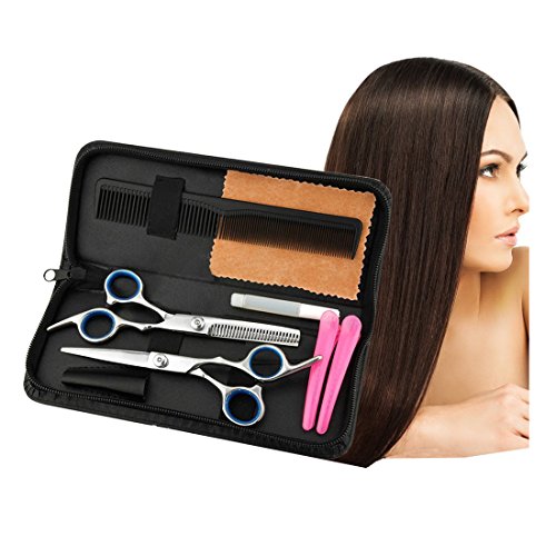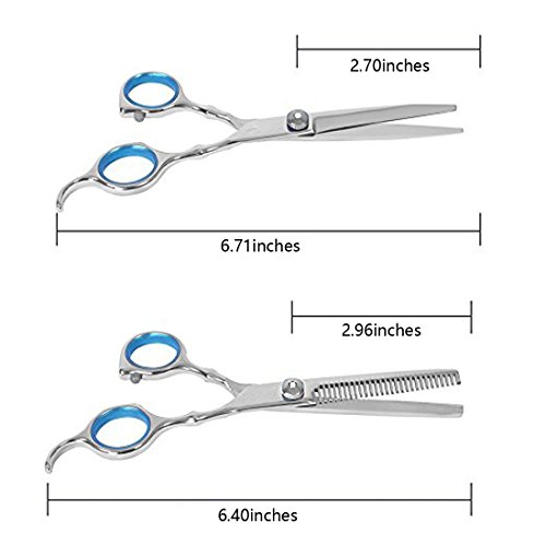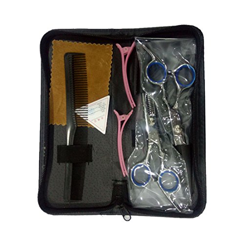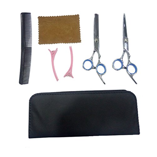Package included: 1 x regular hair scissors; 1 x thinning scissors; 1 x grooming comb, 1*leather cleaning cloth, 2 x hair clips, comes with a leather case for storage.