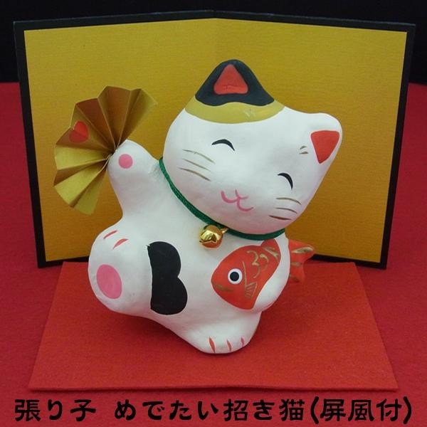 | 扇子と鯛を持って楽しそうに踊っている招き猫の置物です。紙で作った張り子人形で、手描きで絵付けしています。毛氈・金屏風付きで豪華に見えます。玄関やお部屋のインテリアに最適♪ |