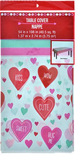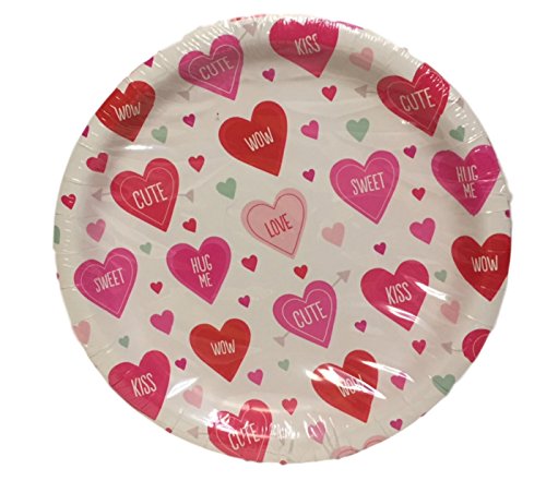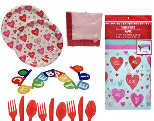 - VALENTINES PARTY DECORATIONS - Included are matching 18 piece pink and white valentine candy hearts decorations with party plates featuring Paper Party Plates (approx. 9 inches), 16 pink party napkins set (approx. 10 inches), 1 54x108 inches tablecloth covered in valentine candy hearts, Plus red plastic cutlery set for 16 guests - spoons, knives & forks