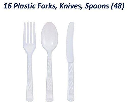 - Cutlery (16 Knives, 16 Forks, 16 Spoons) & 1-54"x102" Plastic Table Cover that looks like grass