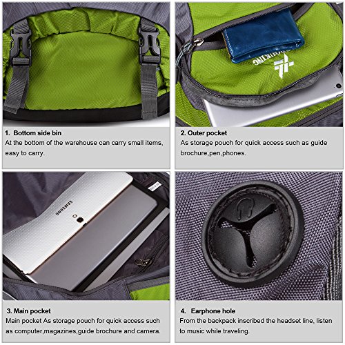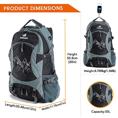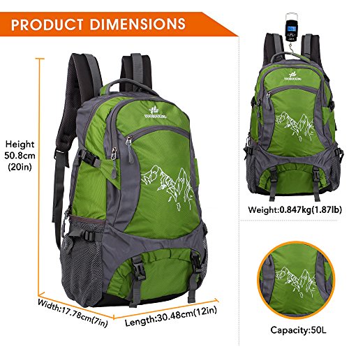 -. Feature : Durable for long-time use: Our travel backpack is made of high quality water resistant and tear resistant material.High intensity nylon material makes it more convenient to carry more load on your trips.Durable 2-way Abrasion Resistant SBS Metal Zipper across the backpack.Earphone hole,From the backpack inscribed the headset line,listen to music while traveling. / Comfortable to wear: Air cushion shoulder straps help relieve your shoulder stress.Adjustable shoulder length,free to adjust to ideal length.3D honeycomb breathable mesh and high elasticity noodles back cushion,relax the back pressure and impact force,promote the circulation of air,breathable and comfortable. / Mountaineering (1.87LB) and roomy (50L)Fit for iPad,14"laptop. / Compact: Product Dimensions: Approx. 20H x 12W x 7D inches (50.8H x 30.48W x 17.78D cm),Three zippered compartments.Main pocket is large enough to carry what you need.Outer smaller pocket doubles as the storage pouch great for quick access such as magazines,guide brochure and camera.Inner zippered pocket which is perfect place for valuables such as cash,credit cards and passport.Two large side mesh pockets for water bottles or umbrella. / Perfect for both daily and outdoor activities.Use it as a carry on for your excess baggage,perfect for day trips,vacation, travel,day hikes,school,camping and shopping.