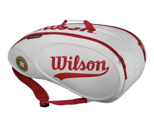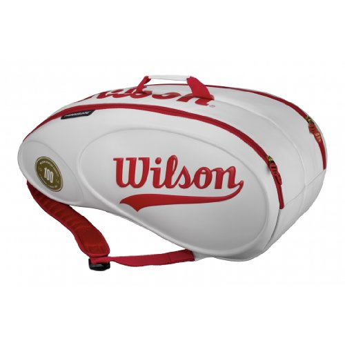 Studio : Wilson Publisher : Wilson Binding : Misc. Product Description This series of clothing and equipment celebrates 100 years of Wilson, paying homage a name that has shared in more winning moments than any other company in sports. 61 Majors. 48 Super Bowls. 20 Final Fours. 93 World Series Championships. And over 500 Grand Slams.Designed with the design and sophistication you would expect from Roger Federer, this bag combines slick styling with the match-day requirements of the very best.The bag is constructed with moulded EVA panels, with a nine-racket capacity and separate compartments for all your gear. It features ThermoGuard and MoistureGuard for better durability and performance, while seven Wimbledon trophies are stitched into the bag to represent the seven titles. 0
