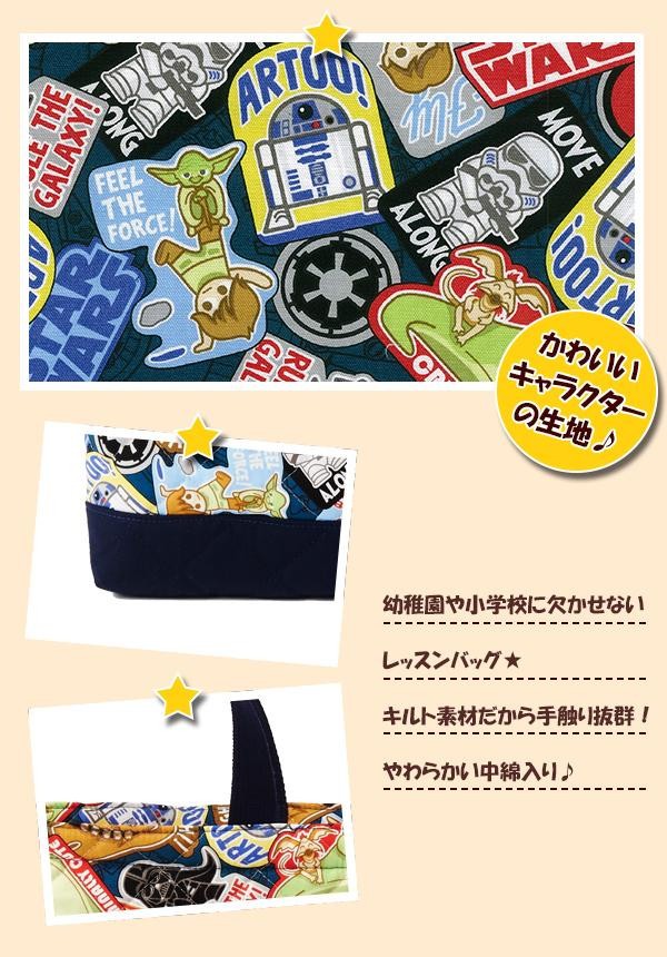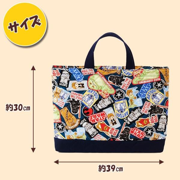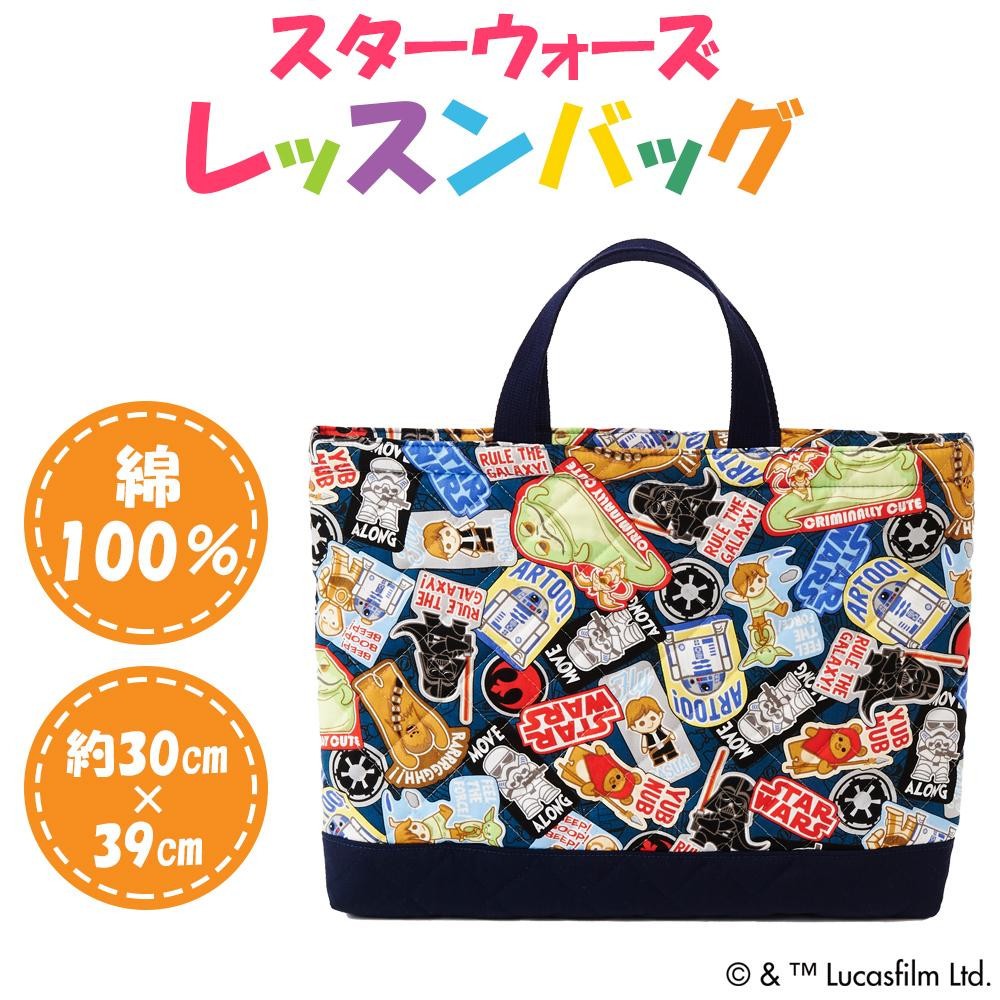 総柄プリントの綿素材を使用し、手作り感のあるように仕上げた商品です。A4サイズもラクラク入りますので、サブバッグにも最適です♪ 製造国:日本 素材・材質:表地・裏地:綿100%中綿:ポリエステル100% 商品サイズ:約H30×W39cm(マチ付き)(持ち手含まず) ※サプライヤー直送品 ご注文後3~4営業日後の出荷となります【商品名】スターウォーズ レッスンバッグ CG-1172 1A