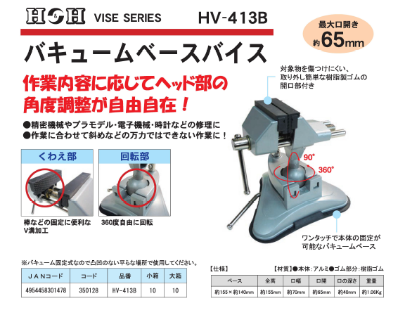 【商品名】H&H バキュームバイス/万力 【最大口開き約65mm】 V溝加工 HV-413B 〔業務用/DIY/日曜大工〕