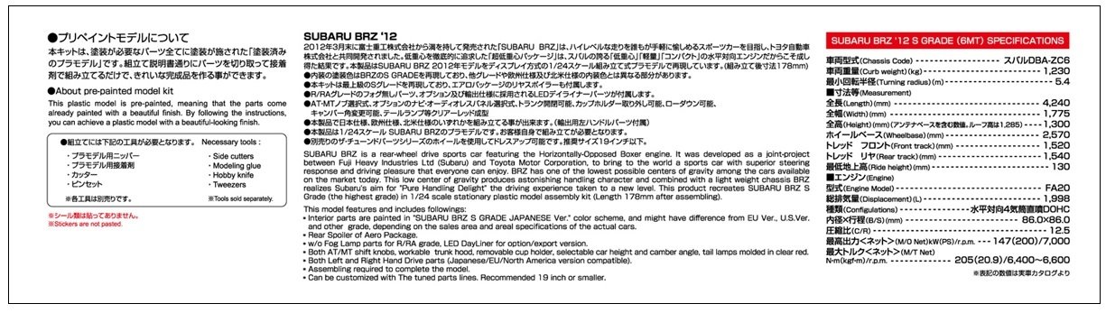 1/24 pre-paint Model Series No.37 SUBARU BRZ 12 WR Blue Mica