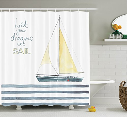 Sailboat Nautical Decor Shower Curtain Set By Ambesonne, "Let Your Dreams Set Sail" Quote Stripes Yacht Interior Navigation Theme, Bathroom Accessories, 69W X 70L Inches, Petrol Blue Yellow White