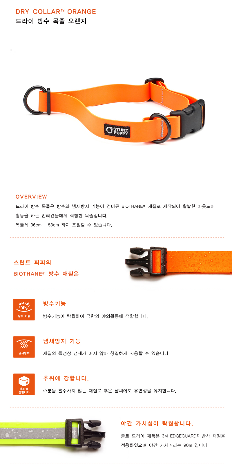 드라이 방수 목줄은 방수와 냄새방지 기능이 겸비된 BIOTHANE® 재질로 제작되어 활발한 아웃도어 활동을 하는 반려견들에게 적합한 목줄입니다.