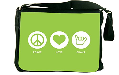 Studio : Rikki Knight LLC Publisher : Rikki Knight LLC Binding : Office Product Product Description Whether from home to the office, on a business trip or to school, the Peace Love Shaka Lime Green color laptop bag notebook bag messenger bag school bag keeps you comfortable and your cargo safe and sound - this bag features pockets on the outside below the flap for your cellphone, pens, iPod, notebook etc. And also a zippered compartment on the inside, with plenty of space to store your textbooks, folders, files, etc. And up to a 14 inch laptop (laptop sleeve sold separately) - the vibrant image on the front is professionally printed and will not fade or peel with time and this bag will surely be an eye catcher wherever you go with it. Disclaimer: all images are printed directly into the material - the Texture of the image will always be a flat surface. Any images that appears to be 3D, textured, or glittery are flat printed images. 0