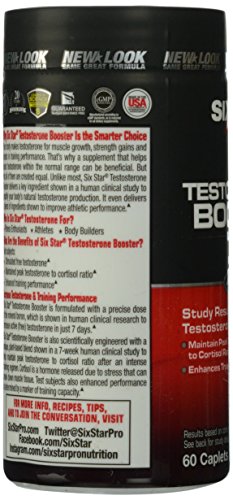 -. Binding : Health and Beauty -. Brand : Six Star -. EAN : 0631656603118 -. Feature : Boost Active (Free) Testosterone in just 7 Days / Enhances training performance / Maintains peak testosterone to cortisol ratio / Shown in human clinical resaerch to amplify active testosterone / Ideal for Active Men -. Label : Iovate Health Sciences Incorporated -. Manufacturer : Iovate Health Sciences Incorporated -. NumberOfItems : 1 -. PackageQuantity : 1 -. ProductGroup : Pantry -. ProductTypeName : HEALTH_PERSONAL_CARE -. Publisher : Iovate Health Sciences Incorporated -. ReleaseDate : 2015-03-19 -. Studio : Iovate Health Sciences Incorporated -. Title : Six Star Pro Nutrition Elite Testosterone Testosterone Booster Capsules, 60 Count (Packaging may vary) -. UPC : 631656603118