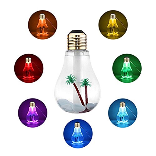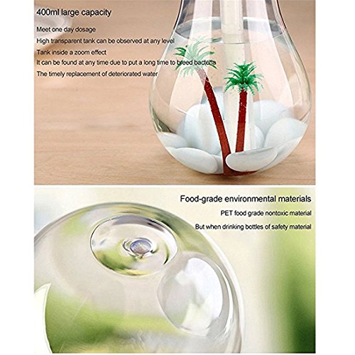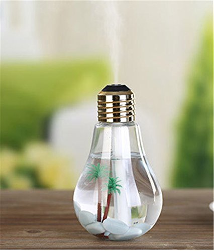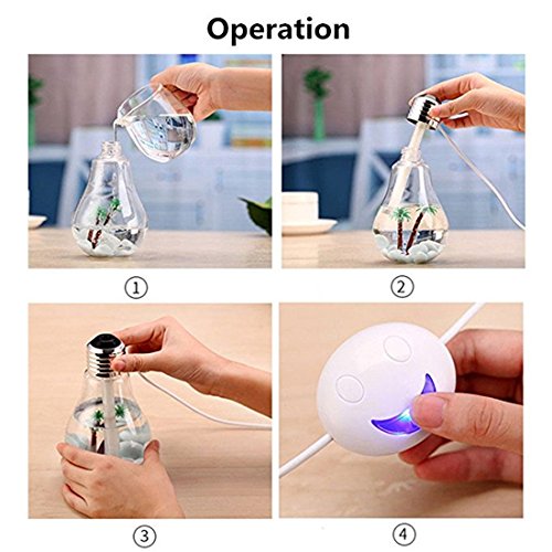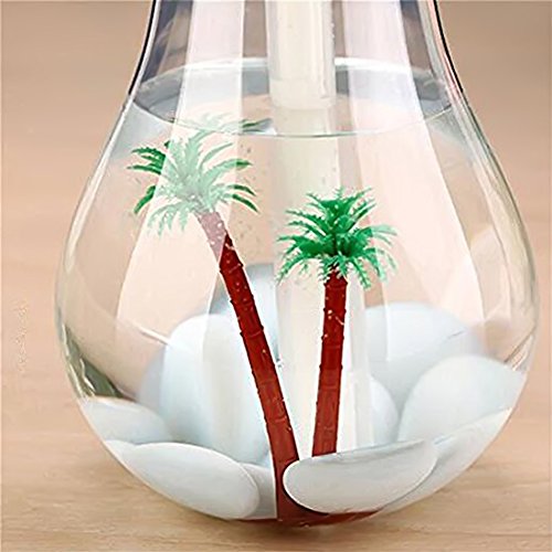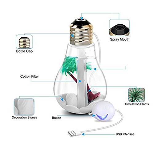 - ① Humidifier & Decoration: The Humidifier shaped like a light bulb, it can be Multi-angle displayed, vertically or tiltly because of the unique design of bottom. This bulb is a perfect decoration with micro landscape inside design to match your room decor.