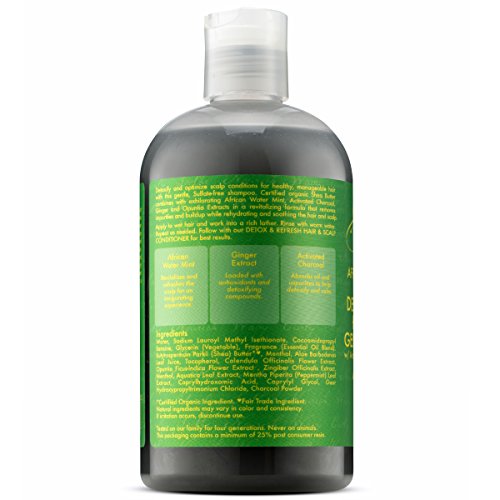 - ertified organic shea butter combines with exhilarating African water mint, activated charcoal, ginger and opuntia extracts in a moisturizing formula that supports healthy scalp, conditions while restoring luster and manageability to hair.