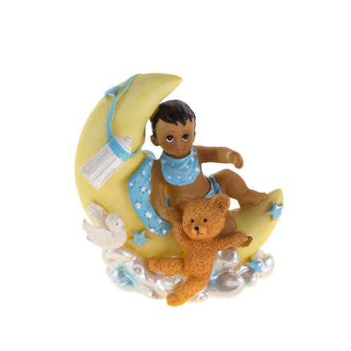 -. Feature : Black Ethnic Baby Sitting on Moon with Embellishment Favors - Blue, Set of 12 / Black Ethnic Baby wearing a bib sitting on moon with teddy bear and dove / These favors are designed for gifting right out of the box and will leave an everlasting memory on your guests / Made of Poly Resin