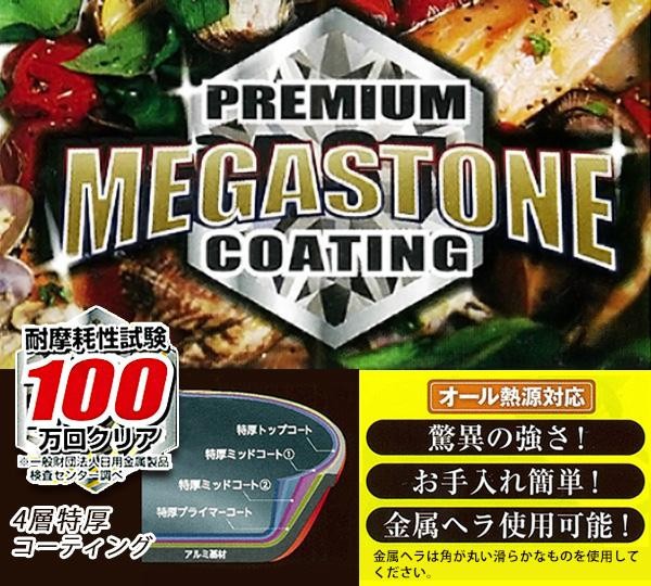 特厚4層コーティングのメガストーンコーティングで耐久性に優れたフライパンです。お手入れ簡単で金属ヘラも使用可能。 |