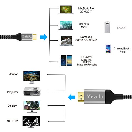 Studio : Yezala Publisher : Yezala Binding : Electronics Product Description Yezala 4K @ 60Hz USB Type C to HDMI 6.6FT Cable is a quick economic effective solution for for connecting a USB C device (compatible with Thunderbolt 3) to HDMI enabled TV/monitor/projector as s Second Display to mirror or extend. Our USB C to HDMI cable is widely used in conference, presentation, gaming or sharing your favorite entertainment with family and friends Easy to Use Just Plug and Play ,No install,Works with USB-C port computers with DP Alt mode to display in HDMI enabled TV/Monitor/Projector.