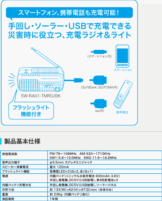 ●手回し、ソーラー、USBで充電可能な超小型バッテリー搭載(600mAh)