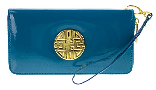 -. Feature : DESIGN: high gloss classy design with emblem; single zipper top closure for: 1 inner zipper slot and 6 inner slip pockets offer great variety of storage, 8 card holders and 1 ID slot. / MATERIAL: manmade high gloss patent PVC leather,solid-colored fabric lining, gold-tone hardware. / ACCESSORIES: this clutch comes with 1 detachable 8.5" wrist strap / DIMENSIONS: exterior 8"Length X 4"Height X 1.25"Width / ORIGIN: Made in China