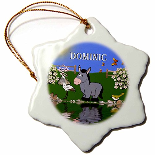 3dRose Orn_50106_1 Decorative Donkey and Bird Art Design for Children Personalized with The Name Dominic Snowflake Decorative Hanging Ornament, Porcelain, 3-Inch