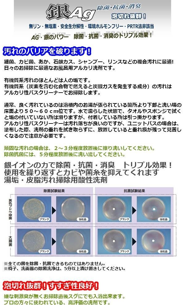 | 銀イオンの力で除菌抗菌消臭強力洗浄。カビ菌の元となる皮脂汚れ湯垢掃除に最適で、刺激臭のないお風呂掃除用アルカリ性洗剤です。 |