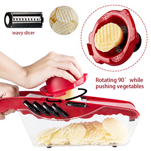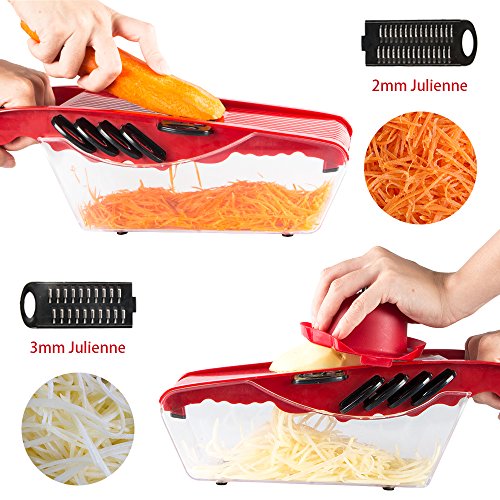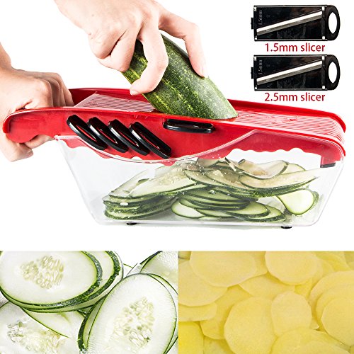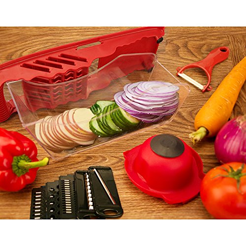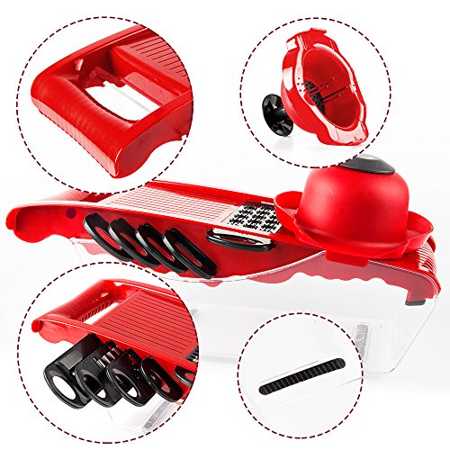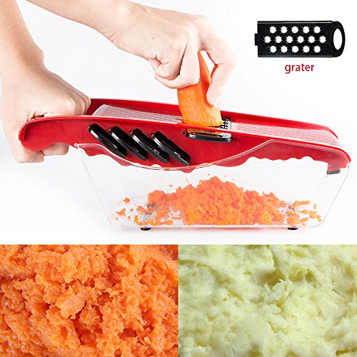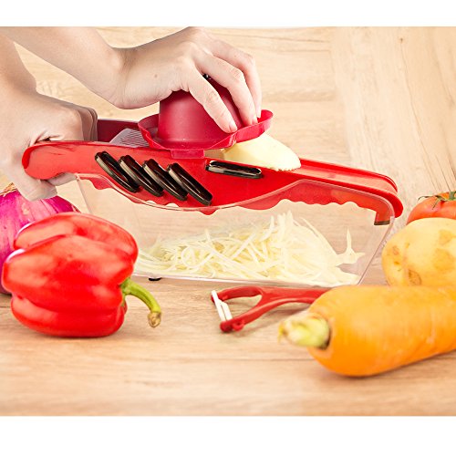 Studio : Atalanta Publisher : Atalanta Binding : Kitchen Product Description Pick Up the Perfect Spiral Slicer, Vegetable cutter, Vegetable Grater All In One. A perfect gift for moms, friends, cooks and health-conscious people, making their life in the kitchen fun and convenient. Save time and effort in the kitchen by using this versatile food slicing tool to cut, chop, grate or julienne all your veggies to perfection! Specifications: Material: PP PS ABS Stainless Steel Color: red Product Size: 11.8 x4.3 x 3.9 inches Package Weight: 1.16 pounds Features: Mandoline Slicer has 6 interchangeable stainless steel blades. - 3mm 4mm julienne - perfect for julienne fresh potatoes, carrots or cucumbers etc. - 1.5mm2.5mm Slicer - to slice your cucumbers, carrots, potatoes etc. - wavy slicer - to slice your veggies with thicker size (about 3mm thick). -grater - Ideal for grating garlic, ginger, cheese or even chocolate! Can create paste-like vegetables or mashed potatoes. It is great if you're on a diet or trying to feed your children. ●Finger guard securely holds food and protects fingers. ● The food container holder base can catches all your slices, shreds and cuts. ● Blade's Container for safe and compact storage. ●Non-Skid Base to keep mandoline in place whilst working on flat surface. ●Including a convenient peeler in red color 0