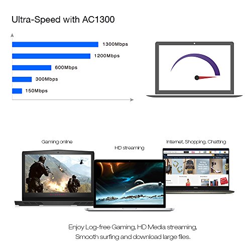 AC1300 ULTIMATE SPEED Super fast speeds up to 867 Mbps at 5G, 400 Mbps at 2.4G and faster than AC1200, dual band works with all Wi-Fi routers ADVANCED MU-MIMO Enables multiple devices to receive data simultaneously, increased Wi-Fi speeds and boost in performance for all connecting devices. With MU-MIMO, you'll be able to simultaneously stream HD video, online gaming, browse the internet and engage in other tasks without lag or buffering. BEAMFORMING TECHNOLOGY Strengthen your Wi-Fi signal to be targeted at your adapter for a stronger, more reliable Wi-Fi connections. Better coverage signal can cover larger homes and offices USB 3.0 Interface Faster access with USB 3.0(compatible with USB 2.0), the adapter delivers speeds 10x faster than USB 2.0 MINI AND LIGHTWEIGHT Small size and compact design, you can connect the nano adapter to any USB port and leave it there.