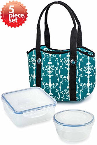 Lock & Lock 5pcs Set Plastic Food Storage Container Airtight Anti-Spill Proof with Teal Tote Alice Cooler Lunch Bag, Picnic bag