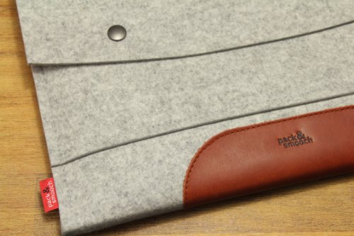 High quality Macbook 13 inch Sleeve "Hamphire" Custom made to fit the Apple Macbook 13 Pro with Retina Display like a glove Pure Merino wool felt (100% German Merino wool felt / No fake felt) Perfect leather grip pad made from luxury Italian vegetable tanned leather (Made in Italy) The frontpocket is perfect for USB, pen, note pad etc. This Macbook case "Hampshire" is custom made for the Macbook 13 Pro with Retina Dispaly" and fits like a perfect glove. The Hampshire sleeve just protects your Macbook from bumps and scratches. It not only protects it also looks amazing. The case is made from 100% natural materials and is definetly constructed to resist. The contrast of very high quality leather from Italy and real wool felt from Germany makes this look very special. Quality and material: We only use high quality leather from Italy. This leather is pure vegetable tanned and the best leather available on the market. You can smell it and feel it. The Italian, family owned tannery, is member of: Consortio vera Pelle Italiana Conciata Al Vegetale We know there is a lot fake felt around there which is very cheap and made from plastic material. We only use high quality German wool felt produced in south Germany. The label Pack & Smooch produces all products under fair working conditions. All products are designed and produced in-house. All products are made by hand. All products are a singel piece of nature.Feature