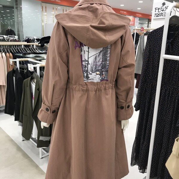 후드딸부착이 가능한 롱 트렌치코트입니다뒷부분 프린트장식이 캐쥬얼하면서 예뻐요박스핏상품으로 원싸이즈입니다