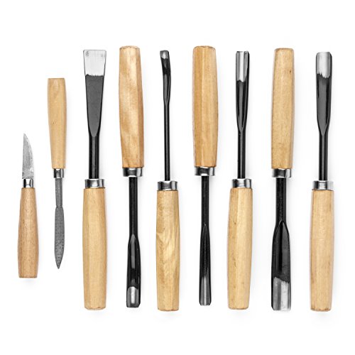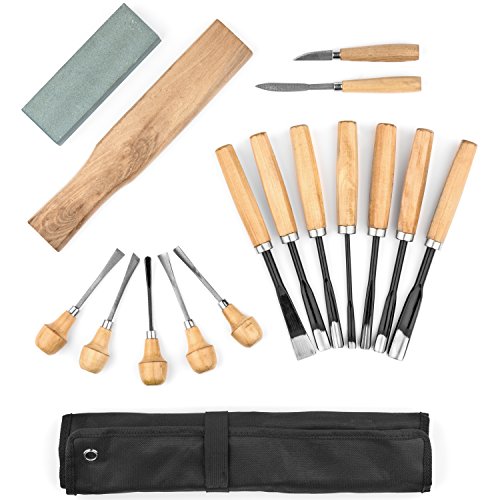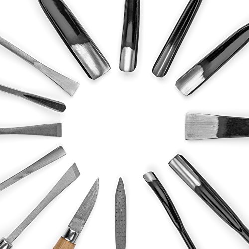 Includes 1 Whittling Knife, 5 Palm Wood Knives, 7 long shaft tools, file, Sharpening stone & Mallet.
