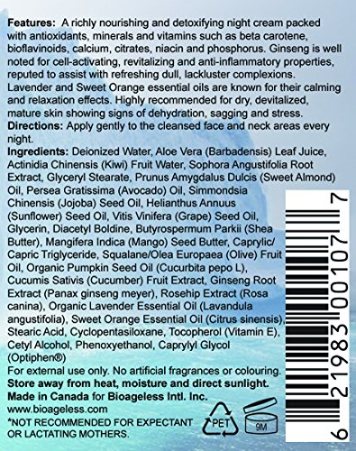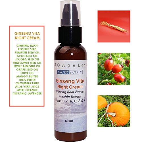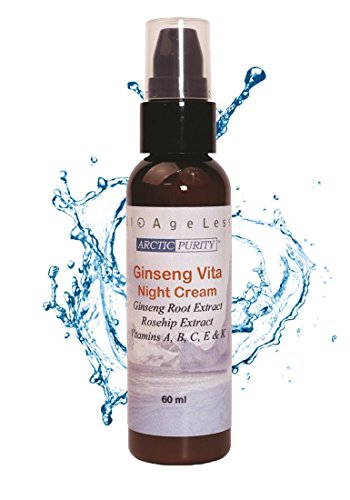 -. Binding : Misc. -. Brand : BIOAgeLess -. EAN : 0621983001077 -. Feature : Thanksgiving Special 50% off ! / Ginseng and Rosehip extracts restore devitalized, dehydrated skin. / Ultra rich in Vitamins A, B, C, E & K from natural botanic sources. / Pumpkin Seed Oil is high in Linoleic Acid with 64% Omega 3 & 6 for active skin rejuvenation. / Detoxifying, anti-inflammatory and cell-activating. Calming and relaxing for a good night's sleep and rest. -. Label : BIOAgeLess Inc. -. Manufacturer : BIOAgeLess Inc. -. Model : 00107 -. NumberOfItems : 50 -. PackageQuantity : 1 -. ProductGroup : Beauty -. ProductTypeName : BEAUTY -. Publisher : BIOAgeLess Inc. -. Studio : BIOAgeLess Inc. -. Title : Arctic Purity Ginseng Vita Premium Night Cream 60 ml. With Ginseng, Rosehip, Pumpkin Seed, Organic Lavender & Sweet Orange. Repair, Restore, Rejuvenate Dull, Lackluster Complexions. Made in Canada. -. UPC : 621983001077