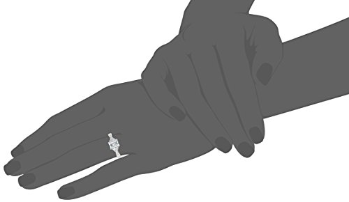 Sterling silver ring featuring emerald-cut centerpiece framed in small clusters and diamond rounds set in cutout shank