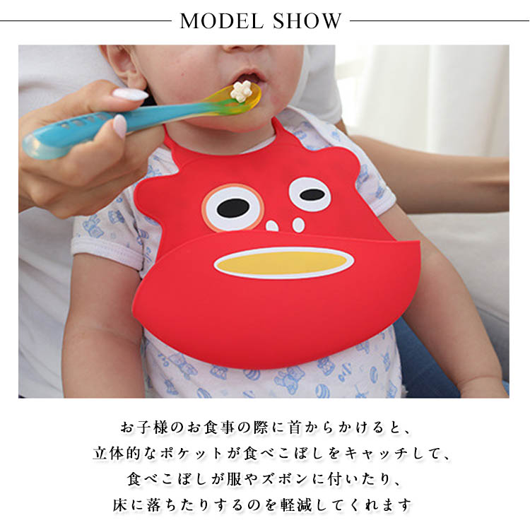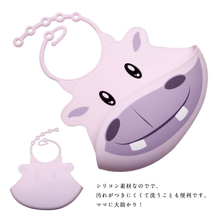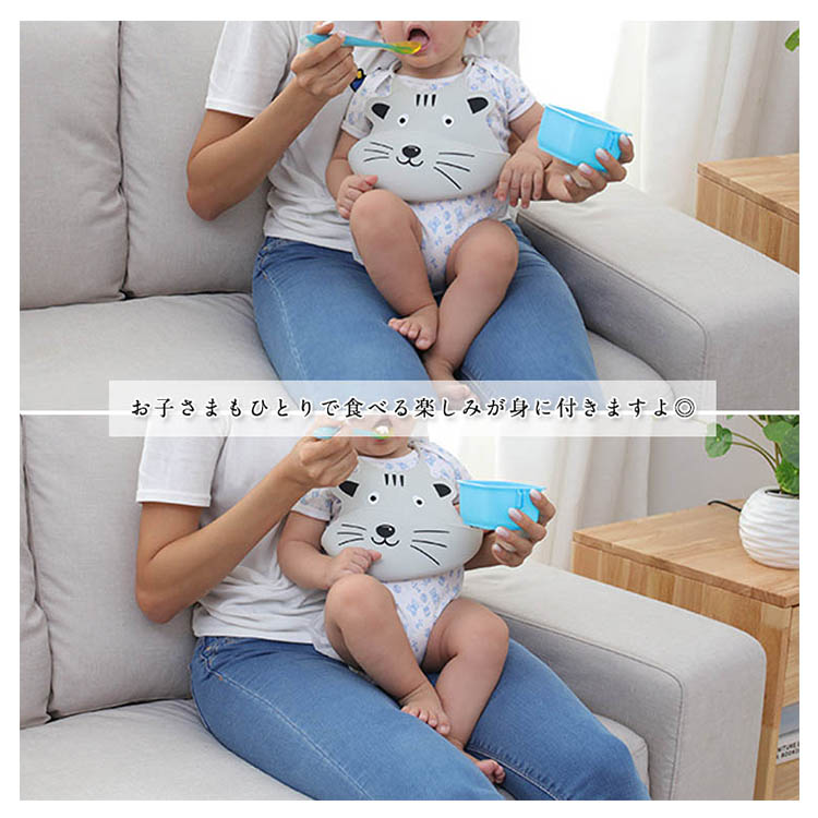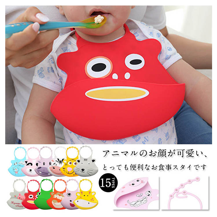 | アニマルのお顔が可愛い、とっても便利なお食事スタイです。お子様のお食事の際に首からかけると、立体的なポケットが食べこぼしをキャッチして、食べこぼしが服やズボンに付いたり、床に落ちたりするのを軽減してくれます。シリコン素材なのでで、汚れがつきにくくて洗うことも便利です。ママに大助かり!お子さまもひとりで食べる楽しみが身に付きますよ◎ | |