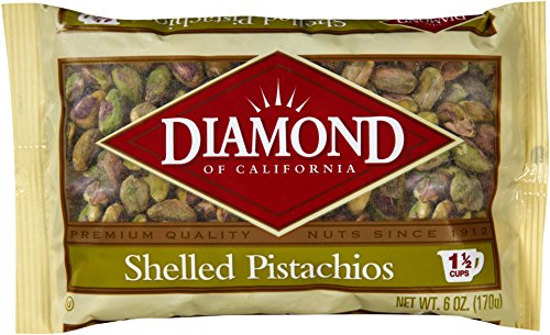 -. Binding : Grocery -. Brand : Diamond Nuts of California -. EAN : 0010300343646 -. Feature : 6-oz bag (1.5 cups) of Diamond of California Shelled Pistachios / Diamond of California has offered fresh, high quality and great tasting nuts for over a 100 years / Unseasoned and ready for baking, cooking, snacking and using as a topping / Kosher Certified -. Label : Diamond Nuts of California -. Manufacturer : Diamond Nuts of California -. NumberOfItems : 1 -. PackageQuantity : 1 -. ProductGroup : Grocery -. ProductTypeName : GROCERY -. PublicationDate : 2014-02-26 -. Publisher : Diamond Nuts of California -. ReleaseDate : 2014-02-26 -. Size : 6 Ounce -. Studio : Diamond Nuts of California -. Title : Diamond Nuts of California Pistachios, 6 Ounce -. UPC : 010300343646