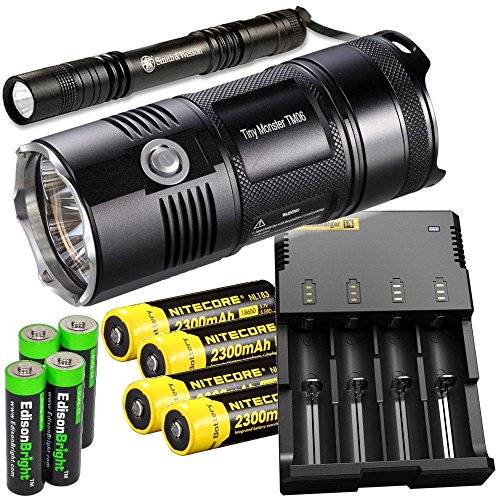 NITECORE TM06 3800 LUMEN CREE LED SUPER COMPACT FLASHLIGHT/SEARCHLIGHT, NITECORE I4 SMART CHARGER, 4 X NITECORE NL183 18650 LI-ION BATTERIES, SMITH & WESSON PATHMARKER LED FLASHLIGHT, WITH 4 X EDISONBRIGHT AA ALKALINE BATTERIES BUNDLE