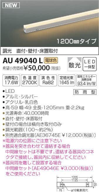 ●別売適合調光器〔AE36745E \12,000(税抜)〕※電源穴の位置にご注意下さい※器具を突き合わせて連結する場合中間線セットは不要です。連結する器具のコネクタで接続し、器具内に収納してください※器具間を離して設置する場合中間線セット〔AE49046E \3,000(税抜)〕をご使用ください