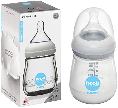 -. Binding : Baby Product -. Brand : Joovy -. Color : Clear -. Department : baby-boys -. EAN : 0877408002420 -. Feature : The vent's tabs fit perfectly into the bottle's neck, ensuring a proper fit and eliminating leaks or inconsistent liquid flow / The bottle does not require assembly and there is no need to touch any part that comes in contact with the milk or formula / Made from durable polypropylene plastic, each bottle is individually shrink-wrapped to deliver the highest level of cleanliness / Bottle Insulator works with installed nipple/collar / The 5-ounce bottle includes a Stage 1 nipple (slow; 0+ Months). -. Label : Joovy -. Manufacturer : Joovy -. Model : 00242 -. MPN : 00242 -. PackageQuantity : 1 -. PartNumber : 00242 -. ProductGroup : Baby Product -. ProductTypeName : BABY_PRODUCT -. Publisher : Joovy -. ReleaseDate : 2014-01-17 -. Size : 5 Ounce -. Studio : Joovy -. Title : Joovy Boob PP Baby Bottle with Insulator, Clear, 5 Ounce -. UPC : 877408002420
