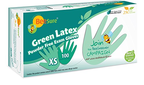 BeeSure BE2835 Green Latex Powder Free Exam Gloves, X-Small (Pack of 100)