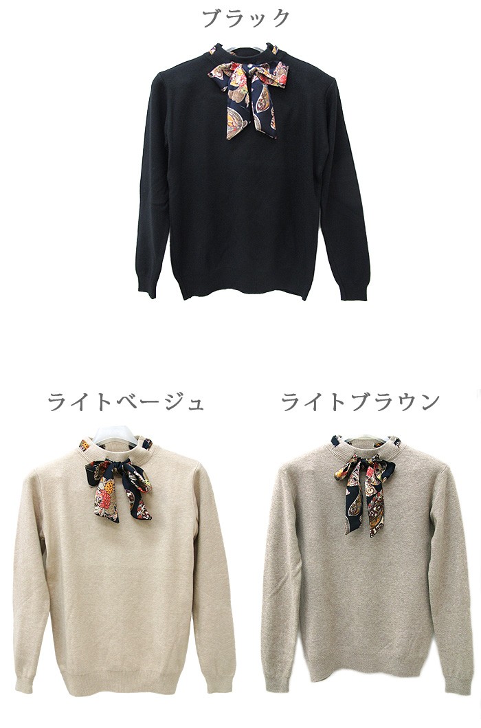 【デザイン】程よくボディにフィットし、女性らしく着こなせるニットトップス。スカーフのネックデザインがフェミニンなアクセントに。伸縮性の高いニットなのでストレスフリーな着心地。カラー:ブラック、ライトベージュ、ライトブラウンモデル着用カラー:ブラックモデル身長:160cm原産国:中国製素材:ポリエステル100%サイズ:FREE(総丈:53cm/胸囲:41cm/肩幅:34cm/袖丈:50cm/袖口:5cm)