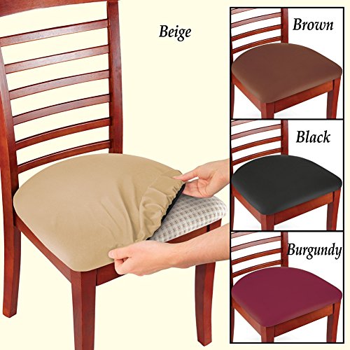 - Easy fit seat covers stretch to fit oblong, square or round chair seats. Perfect for dining room chairs, bar stools, patio cushions and more