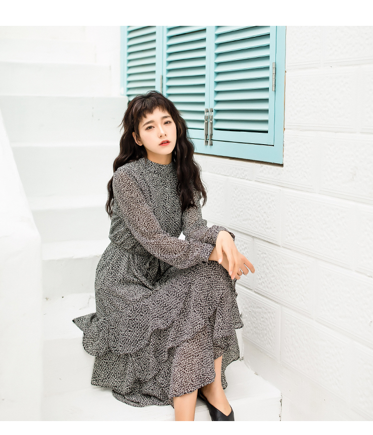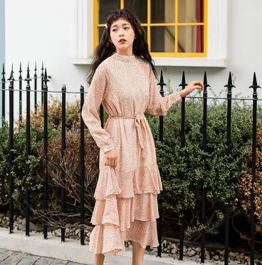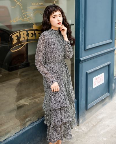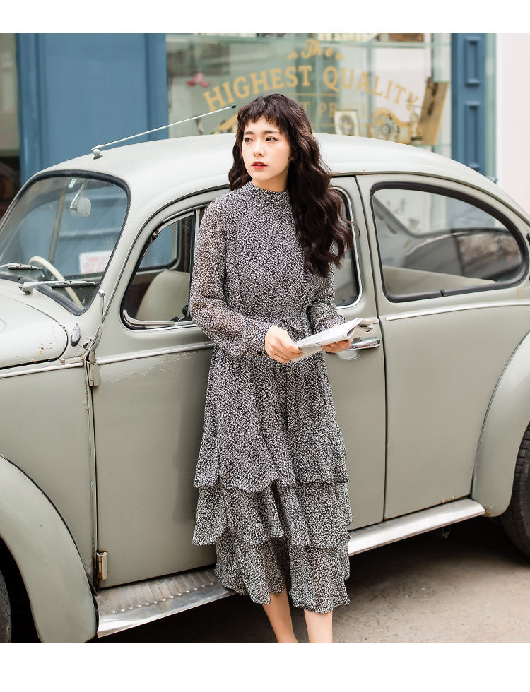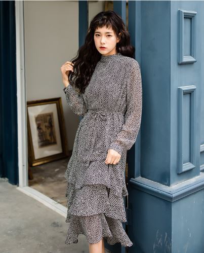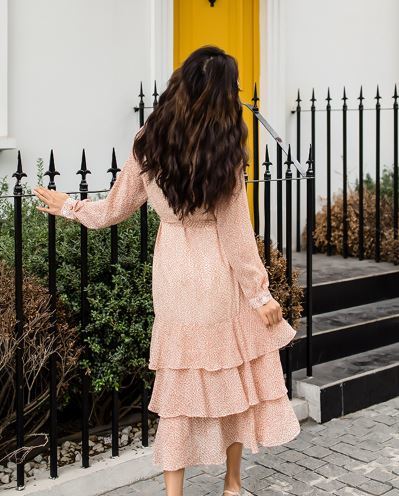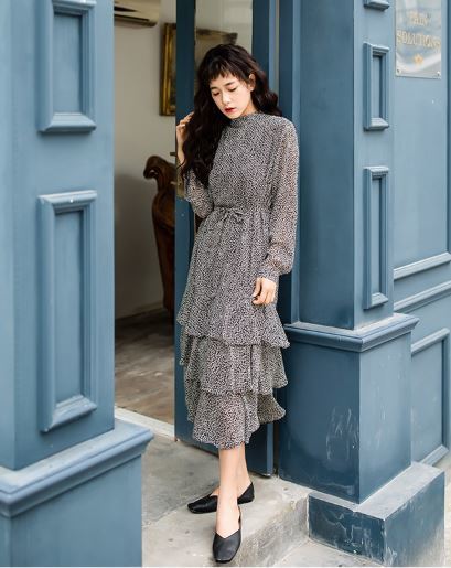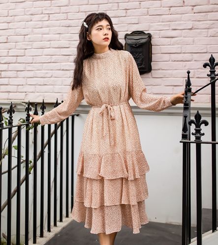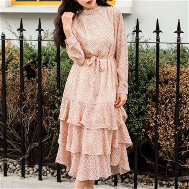 ふわりと広がるティアードスカートがとってもフェミニンな長袖ワンピースのご紹介です。