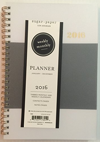 -. Binding : Office Product -. Brand : Sugar Paper -. Color : Black and White -. EAN : 0847037178919 -. Feature : Tabbed Monthly and Weekly Calendars, January-December 2016 / Clear Plastic Protective Cover on Font and Back / Contacts and Notes Pages / 2016 & 2017 Yearly Overview Page and 2016-2019 Holidays Page / Pages Accented with Black Dots and Lines -. Label : Blue Sky Distribution -. Manufacturer : Blue Sky Distribution -. Model : 17891 -. MPN : 17891 -. PackageQuantity : 1 -. PartNumber : 17891 -. ProductGroup : Office Product -. ProductTypeName : OFFICE_PRODUCTS -. Publisher : Blue Sky Distribution -. Studio : Blue Sky Distribution -. Title : Sugar Paper 2016 Planner 5x8, Weekly/Monthly - Black Cabana -. UPC : 847037178919