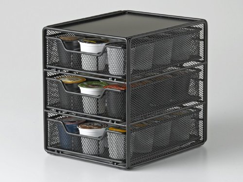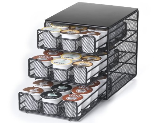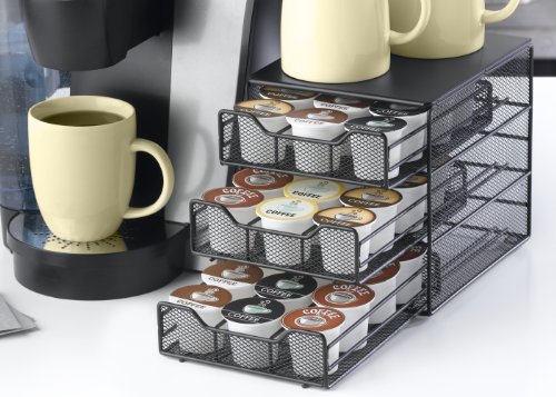 The Nifty K-Cup Drawer is a stylish, space saving way to store your favorite K-Cups. The efficient, space saving design allows you to store up to 54 K-Cups, while taking up very little of your precious counter space. The three-tier sliding drawer construction makes selecting your favorite K-Cup extremely easy. The satin black finish looks great on any kitchen countertop.