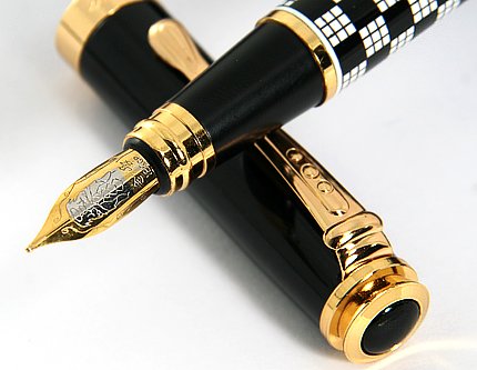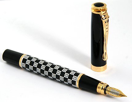 -. Feature : Noblest Black Chessboard Golden Clip Fountain Pen / Length(Approx): 140mm Weight(Approx): 34g Diameter:15.3mm / NIB M 14KGP Cap: PUSH ON /OFF / Ink Cartridge International Standard, Removable Converter & Refillable / COMES WITHOUT INK!