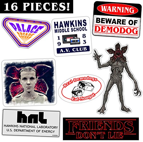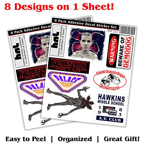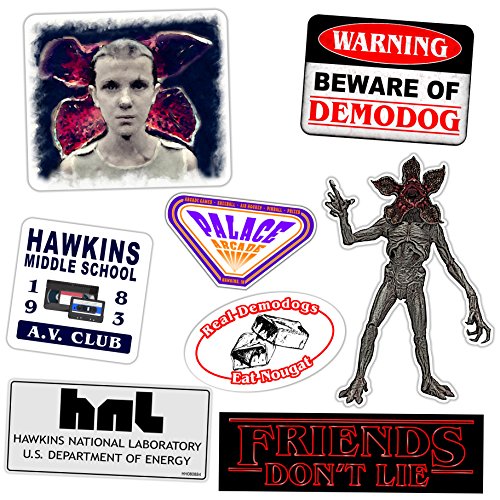 -. Title : Stranger & Things Vinyl Sticker Decal Set for Car, Laptop, Glass, Etc. | Demodogs, Demogorgon, Hawkins Lab, Eleven, Hawkins Middle School AV Club, Palace Arcade | Sizes up to 6.5"