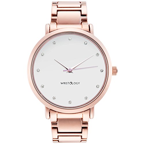 The Olivia Womens chunky boyfriend watch by WRISTOLOGY is gorgeous and oh-so-dainty. She features an on-trend, super slim case in beautifully feminine rose gold, a blank white face embellished with a crystal time index, and a gorgeous metal link strap. She looks great and transitions from day to night like a pro.