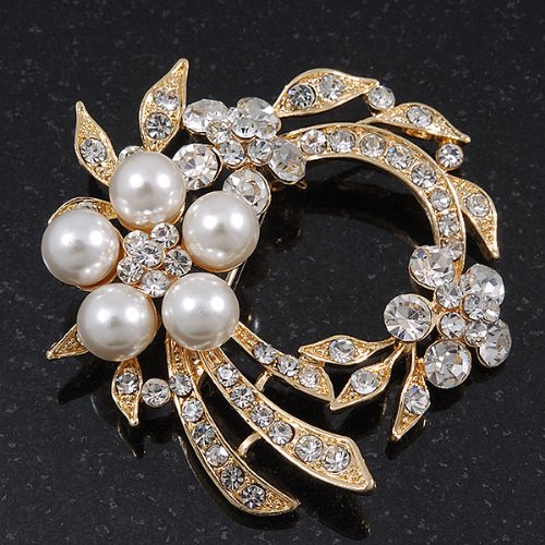 -. Title : White Synthetic Pearl/ Clear Crystal Wreath Brooch In Gold Plating - 5cm Diameter