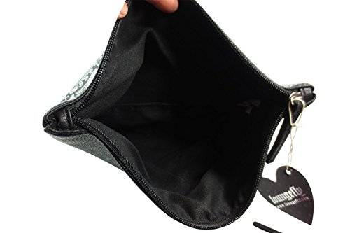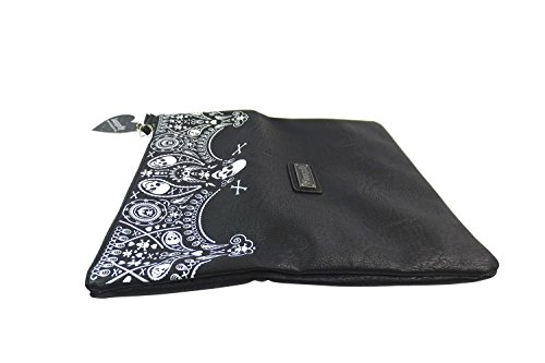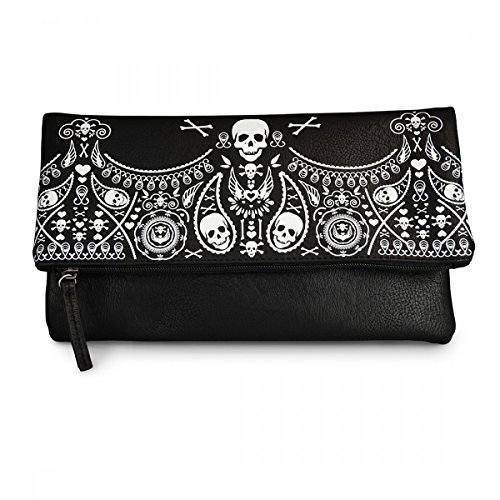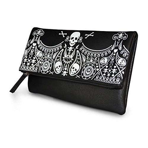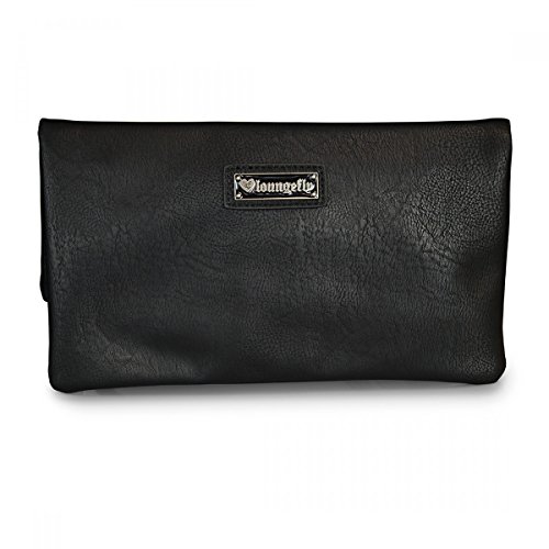 -. Brand : Loungefly -. Color : Black -. Department : womens -. EAN : 0720066467646 -. Feature : Front snap and zipper closure, 2 interior side pouches. Fully lined. / Measures: 11.5 x 7 x 1.5 / Perfect size for evening or to throw in your larger bag! / Fold Over Clutch -. Model : LFWC0028 -. PackageQuantity : 1 -. ProductGroup : Shoes -. ProductTypeName : HANDBAG -. Title : Loungefly Rockabilly Biker Lady Black Bandana Skull Large Fold Over Clutch -. UPC : 720066467646